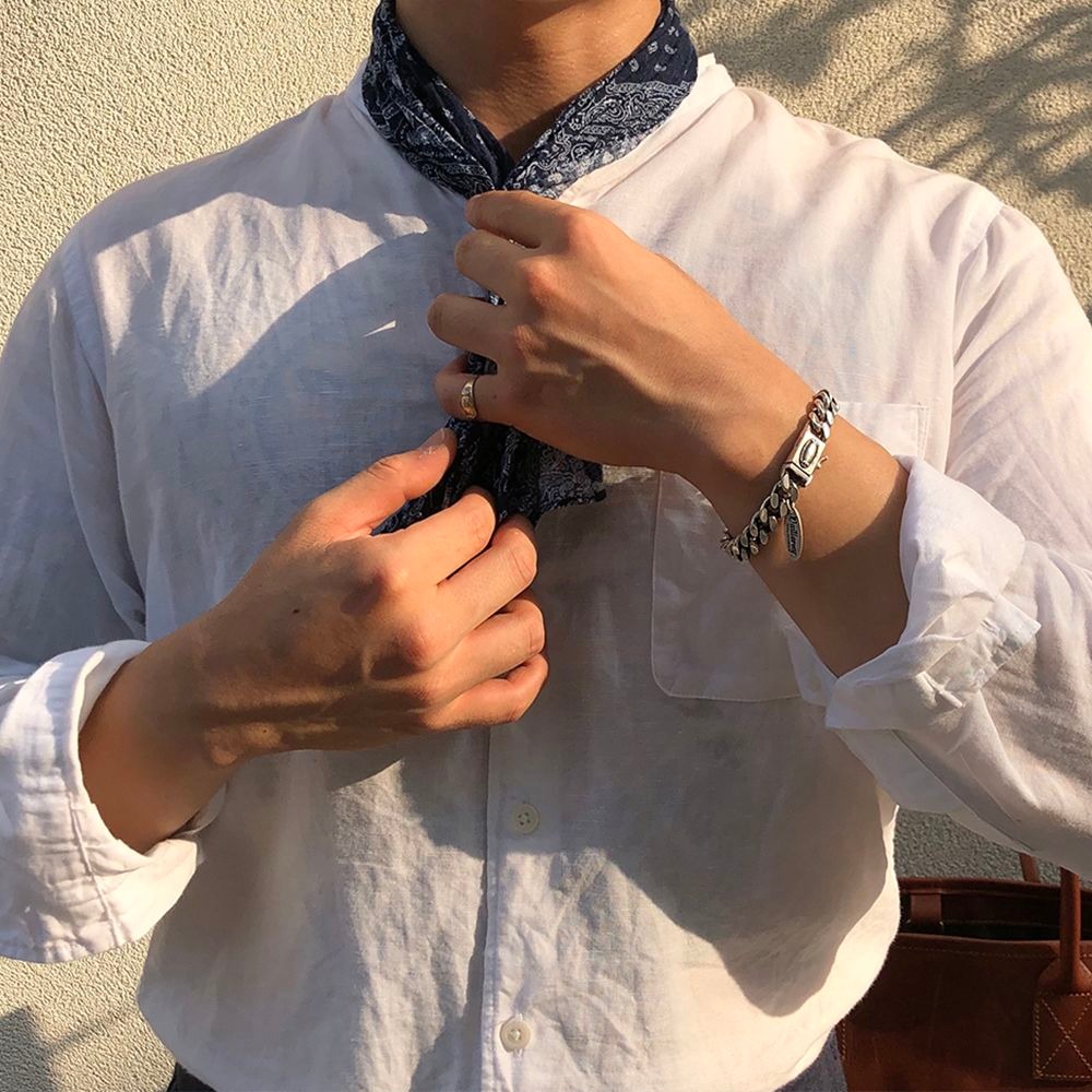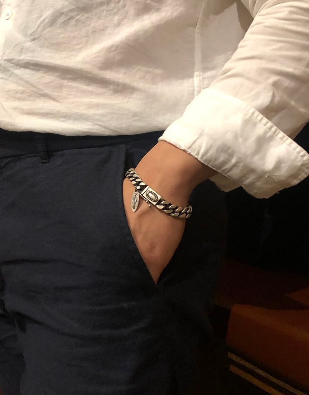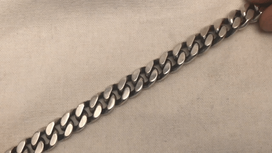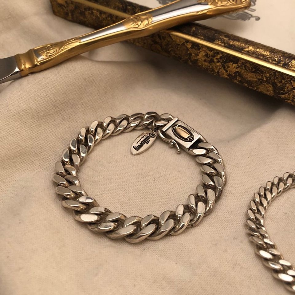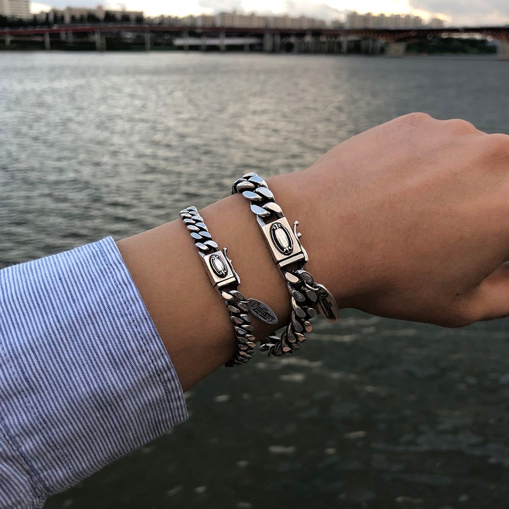 클래식한 타원형 문양이 위치해있는 면체인 형식의 실버 체인 팔찌 입니다.